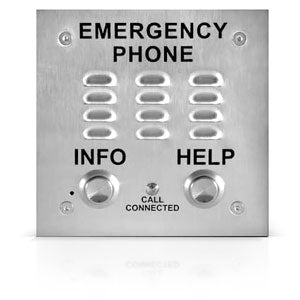 A.D.A. Compliant Emergency Speakerphone with Info Button is designed to provide quick and reliable handsfree communication for any standard analog telephone line or analog phone system station port. E-1600-20A features a second Info button that will dial up to 3 non-emergency numbers. E-1600-20A meets ADA requirements for elevator/ emergency telephones, and can be programmed from any Touch Tone phone.