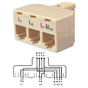 Designed for use with a line jack arranged for a 2-line telephone system in accordance with USOC RJ14C and RJ14W. The unit consists of a 6-position, 4-conductor modular plug internally wired to 3 modular jacks. Two single line telephone sets and a 2-line set are accommodated.