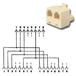 Designed to connect two devices to one modular jack, wired for "10 Base T" applications. It has an 8-position, 4-conductor plug and two 8-position, 4-conductor jacks.