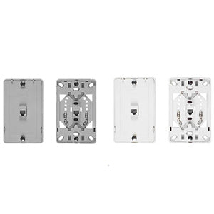 Complete wall jack used to mount a modular wall telephone set. Includes plastic base with internal screw-terminal connecting block and a plastic face plate.