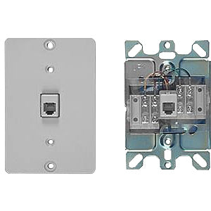 Modular jack assembly, 4 or 6-conductor with light ash plastic face plate and a screw terminal connecting block. May be used as a wall telephone jack or flush mounted jack. Includes two screw mounting studs which are required when the assembly is used as a wall telephone jack and two plastic hole plugs for use when the unit is used as a flush wall jack.
