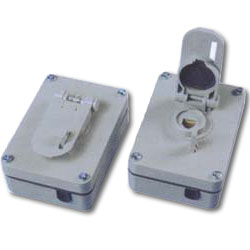 A sturdy, high-impact grey plastic assembly consisting of a base and cover. The base provides a integral screw-type connecting block and a wire entry port weather-sealed by a molded neoprene nipple. The cover with integral jack and spade-ended leads is provided with a hinged, spring-loaded door and neoprene seal insert. The seal between base and cover is insured by a neoprene gasket.