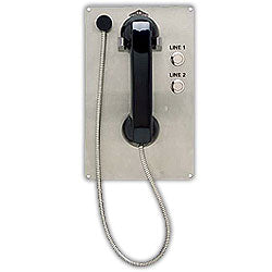 Telephone with no dial pad and programmable 2 number dialer. Simply lift handset and press either button. Fits into weather resistant housing (GB90H or GB5955H). Features: Single line panel mounted...