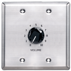 35 Watt Attenuator With Bypass allows the output level of a group of loudspeakers to be controlled from a wall-mounted volume control, without affecting overall amplifier volume settings.