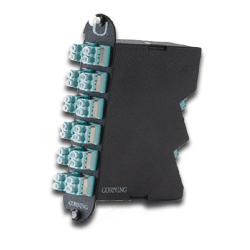 • The module features duplex port adapters across the front and one or two MTP Connector adapters across the back