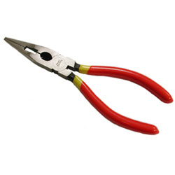 Two-in-one design crimping pliers combine a UR/UY/UG connector crimper with a needle nose pliers. This means one less tool on your belt. Aligned crimping jaws come down square ensuring a solid connection. Jaws are grooved to provide a better grip on wires and feature a built-in cutter and wire stripper. Forged of high quality steel with coated ergonomic handles for a reliable grip. 6-1/2" overall length.