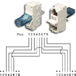 • Splitting Y adapter converts a T568B wired RJ45 jack into two 2 pair jacks