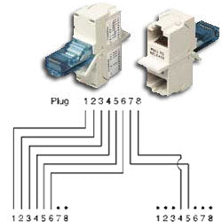• Converts a T568B wired RJ45 jack by splitting pairs 1, 2, and 3 to first 6-positions of jack (1), and pair 4 to positions 4 and 5 of jack (2)