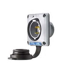 Shrouded Watertight 20 amp, 250 volt, flanged inlet locking receptacle.