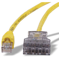 110 to 8 position RJ45 patch cord. Provides modularity and quick termination to 110 connecting blocks. Incorporates a pair isolation/crosstalk elimination technique within the plug to provide superior performance.