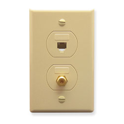 RJ-11 Voice and F-Type Designer Wall Plate. Features: Configured to fit standard single gang outlet box Designed for all voice connectivity, audio, and video applications to the work area for...