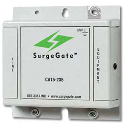 SurgeGate Category 5e Building Entrance Protector (235V)- Protects high performance 4 pair Category 5e outside plant cables as well as Category 5e UTP cables for voice or ISDN applications (235V clamping). Use between buildings in a campus environment as a building entrance protector or in hostile industrial applications as an isolated loop protector.