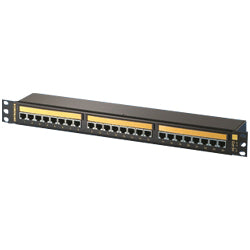24-Port Shielded Category 5e High Density Patch Panel has modular eight-position jacks (universal T568A/B) to 110 termination. Panel includes removable cover for EMI RFI protection and rear cable management shelf