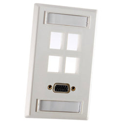 Single gang plastic faceplate holds four Keystone jacks or modules and allows for a flush jack finish. Faceplate Features: Color: Fog White Includes an integrated VGA to crimp pin connector...