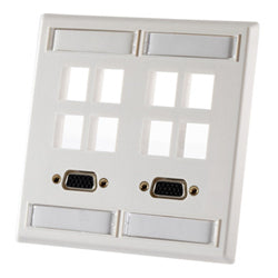 Double gang plastic faceplate, holds eight Keystone jacks or modules. Faceplate Features: Allows for a flush jack finish Includes two integrated VGA to crimp pin connector. Color: Fog White