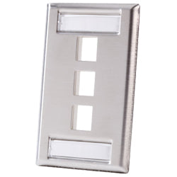 Single gang stainless steel faceplate, holds three Keystone jacks or modules.