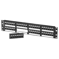 Category 6 patch panel, 48-port, universal T568A/B wiring, six-port modular, 2 rack units.