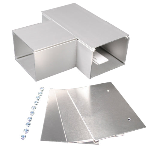 AL4000 series Flat Tee with coupling. Flat Tee Features: Makes branch connections of two runs of AL4000 Series Raceway Includes three (3) sets of two (2) AL4001 Couplings