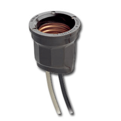 Phenolic pigtail type medium lamp base with brass screw shell. Leads are soldered and hot waxed in deep well. Features: 660 watts 250 volts No. 14 AWG 6" long leads...