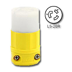 Locking 20 amp female connector with yellow nylon body and cord clamp. NEMA configuration # L5-20R. Features: All current-carrying metal parts (blades, terminals & screws) are electroless nickel-coated Cord clamp...