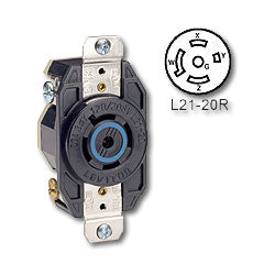 Locking 20 amp, 120/280 volt, 3 phase receptacle. NEMA configuration # L21-20R. Features: Stamped-in agency certifications Contacts deeply seated in thick walled face