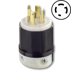 Locking 30 amp, 3 phase, 480 volt plug with black & white nylon body and cord clamp. NEMA configuration # L16-30P.
