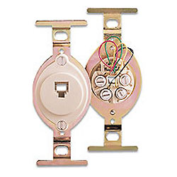 A 4-conductor jack with Type 43A mounting bracket attached. Mounts in any standard electrical box; slotted holes facilitate alignment when electrical box has been mounted crooked or askew. For use with 4-conductor modular line cord. Screw terminals. UL Listed and CSA Certified.