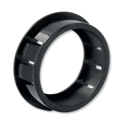 Snap in grommet reduces 1.406" to 1.00" for use with single receptacle wallplates (black).