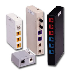 Leviton has a surface mount housing to suit your need. 1, 2, 4, 6 and 12 port housings are easily field configured with QuickPort Snap-in Modules (sold separately) which can be terminated directly in each port. The 2-port version comes with a blank filler to cover and protect one unused opening. The 4 and 6 port housings are sized to completely cover a single-gang NEMA wallbox opening, while the 12 port fits over a single or double gang NEMA box opening. Housings contain knockouts to accommodate raceway and cable entry, with built-in strain relief to assure undisturbed connections, and easy cover latches allow for easy adds, moves and changes. All housings can be mounted with screws or adhesive mounting tape (both provided), or with magnets or modular furniture brackets. Identify ports and stations by using ample space next to each port or the designation window. All housings are UL Listed and compliant with NEC Article 800.