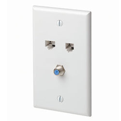 Quickplate with one data port (Cat 5e, T568A wiring), one phone (USOC), and one F-connector (2.5 GHz, SCTE compliant). Available colors: Ivory White Almond Light Almond