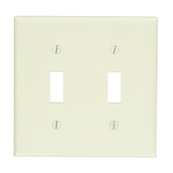 Light almond standard size, thermoset, device mount, switch wallplate. Features: Type: Standard Size Gang: 2 Device Graphic: Toggle Material: Thermoset Color: Light Almond Mount: Device Standards and Certifications: UL/CSA