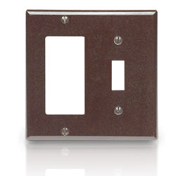 2-Gang, 1-Decora 1-Toggle. Features: Smooth face and rouded edges that resist dust accumulation Individual plastic wrapping to protect surfaces Color-matched mounting screws supplied Material: Thermoset (plastic)