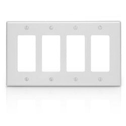 4 gang Decora style wallplate. Used to hide wall irregularities or larger openings. 0.375" higher and wider than standard wallplates.