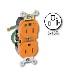Hospital grade back and side wired 15Amp duplex receptacle with 6" ground lead. Features: 15Amp 125V NEMA5-15R 2P, 3W Straight blade Hospital grade Self grounding Steel strap Available in orange...