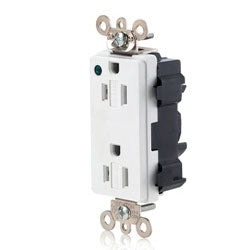 Lev-Lok Decora Plus 20 Amp Extra Heavy Duty Hospital Grade Receptacle with Power Indication is part of the new line of 15 and 20 Amp devices Engineered for fast and easy installation. The Lev-Lok Modular Receptacle System consists of a wiring module (locking connector with leads) and a rugged duplex receptacle with solid brass locking connection pins. Place the wiring module over the receptacle's locking pins, twist clockwise and the connection is secured.