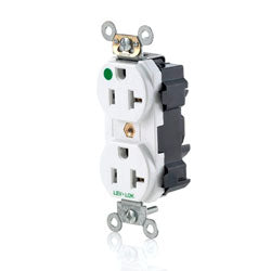Lev-Lok Heavy Duty Modular 20 Amp Duplex Straight Blade Hospital Grade Receptacle is part of the new line of 15 and 20 Amp devices engineered for fast and easy installation. The Lev-Lok Modular Receptacle System consists of a wiring module (locking connector with leads) and a rugged duplex receptacle with solid brass locking connection pins. Place the wiring module over the receptacle's locking pins, twist clockwise and the connection is secured.