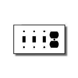 4-Gang toggle switch and duplex receptacle. Features: Standard size Thermoset Device mount Residential grade Combination device 4-gang