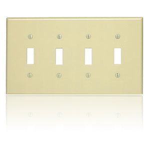 4-Gang toggle device switch wallplate. Features: Midway size Thermoplastic nylon Device mount