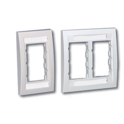 Mini-Com Classic and Executive Faceplate Frame (Package of 5). Single gang faceplate frame accepts up to two 1/2 size module inserts or three 1/3 size module inserts. Supplied with labels and label cover/screw covers. Double gang faceplate frame which accepts up to four 1/2 size module inserts or six 1/3 size module inserts. Supplied with labels and label cover/screw covers.