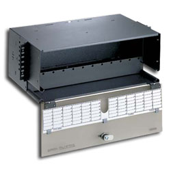 Accepts up to (12) FAP or FMP adapter panels, (1) splice tray holder (FST24H3) and (3) splice trays (FST24). Supports up to (96) ST*, (144) SC or (144) FJ fiber optic terminations. Dimensions: 6.9" H x 11.65" D x 19.0" W (175.3mm x 295.9mm x 482.6mm).
