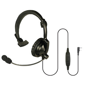 Rugged Over-the-head headset FOR PORTABLE RADIOS with noise-cancelling boom mic and padded speaker.
