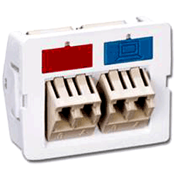 Provides 2 - LC adapters (2 fibers each). Angled with patented gravity-feed design for controlling the bend radius of fiber cables at the work area. "Universal" to support either multi-mode or single-mode fiber connections.