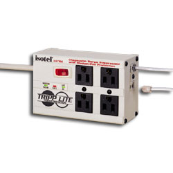 Tripp Lite's Isotel 4 AC Outlet 15 Amp Premium Surge, Spike and Line Noise Suppressor is Loaded with a generous combination of high quality components, near indestructible all-metal case, unique noise filtration system and built-in single line phone suppression for modems, the Isobar / Isotel series offers the highest level of protection attainable in a multi-outlet strip. Includes 6 foot AC line cord with space-saving angled input plug.