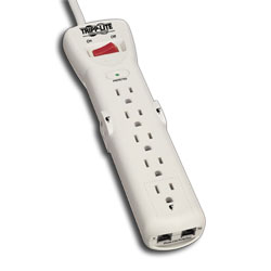 7 AC Outlet Surge, Spike and Line Noise Suppressor with Modem/Fax Protection and 12' Power Cord. Tripp Lite's "Super" models surge suppressors offer room for transformers without blocking outlets as well as complete AC and phone line surge suppression for comprehensive protection of workstations, desktop PCs, telecom systems and other sensitive electronics. High-grade AC surge suppression shields connected equipment from damage and performance problems due to transient surges. Set of RJ11 telephone line suppression jacks protect dialup and DSL modem lines, fax machines, cordless phones and more. SUPER6TEL12 offers diagnostic LEDs to warn of wiring problems and suppressor damage. Heavy grade AC suppression rated at 808 joules shields equipment from surges and line noise. Attractive white suppressor housing with keyhole mounting tabs and 3 designated transformer plug outlets.