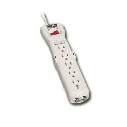 7 Outlet Spike and Noise Suppressor with Coax jacks from Tripp Lite has 7 outlets and a 7-ft. cord with a space-saving right-angle plug. The unit has 2350 joules of surge energy absorption to handle the strongest surges. Built-in coax jacks prevent surges from damaging your cable/satellite equipment. Diagnostic LEDs alert the user to potential power problems.