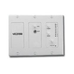 Valcom Main Control Module provides a single auxiliary input. Also supplied is an additional audio input (building page) with an override feature. The V-9983 mounts in a 3 gang deep electrical box and is supplied with a 3 gang white decorator style face plate.