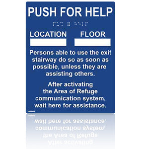 • 6" wide x 7.5" tall Instructional sign with 0.031" raised white "Push For Help" letters and ingraved white text, California compliant Contrated Grade 2 Braille. Blue PMS 294 ABS with non-glare finish, 0.032" thick double sided foam included