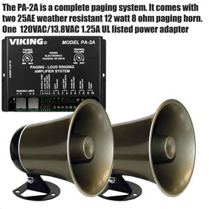 Note:120V AC/13.8V AC 125A, UL listed adapter provided. Also includes one 25AE 8 Ohm paging horn