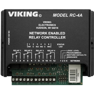 The RC-4A Network Enabled Relay Controller provides networked control of four relays via an easy-to-use web interface. The same interface can be used to check the status of four contact closure inputs. Relays can be toggled on or off, or user-programmed timed closures can be activated.